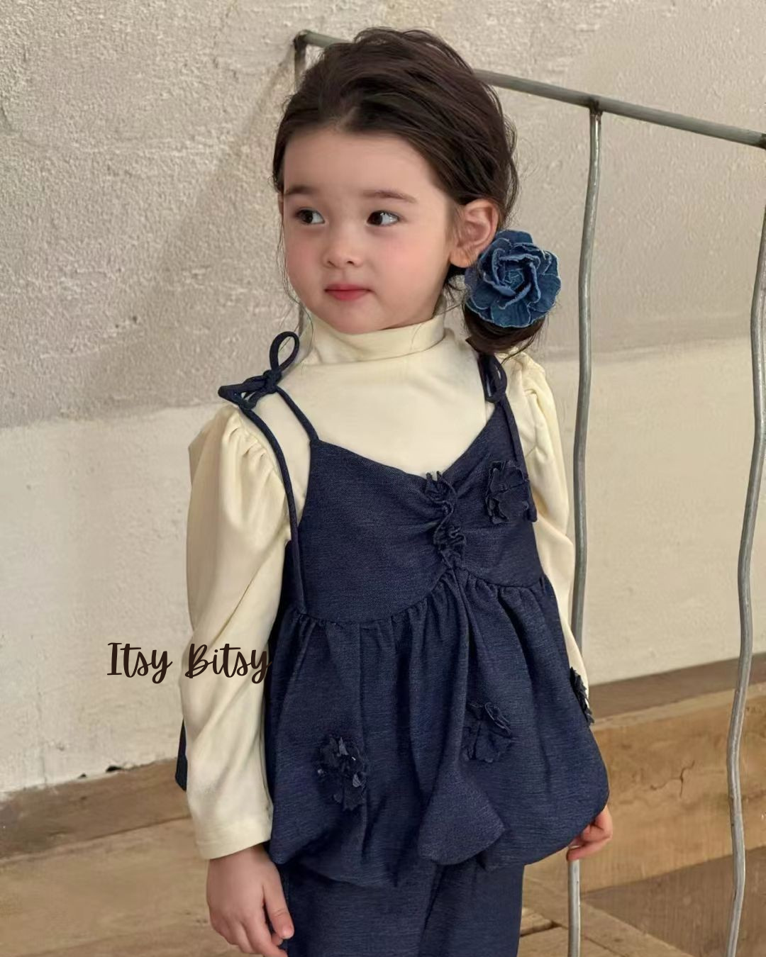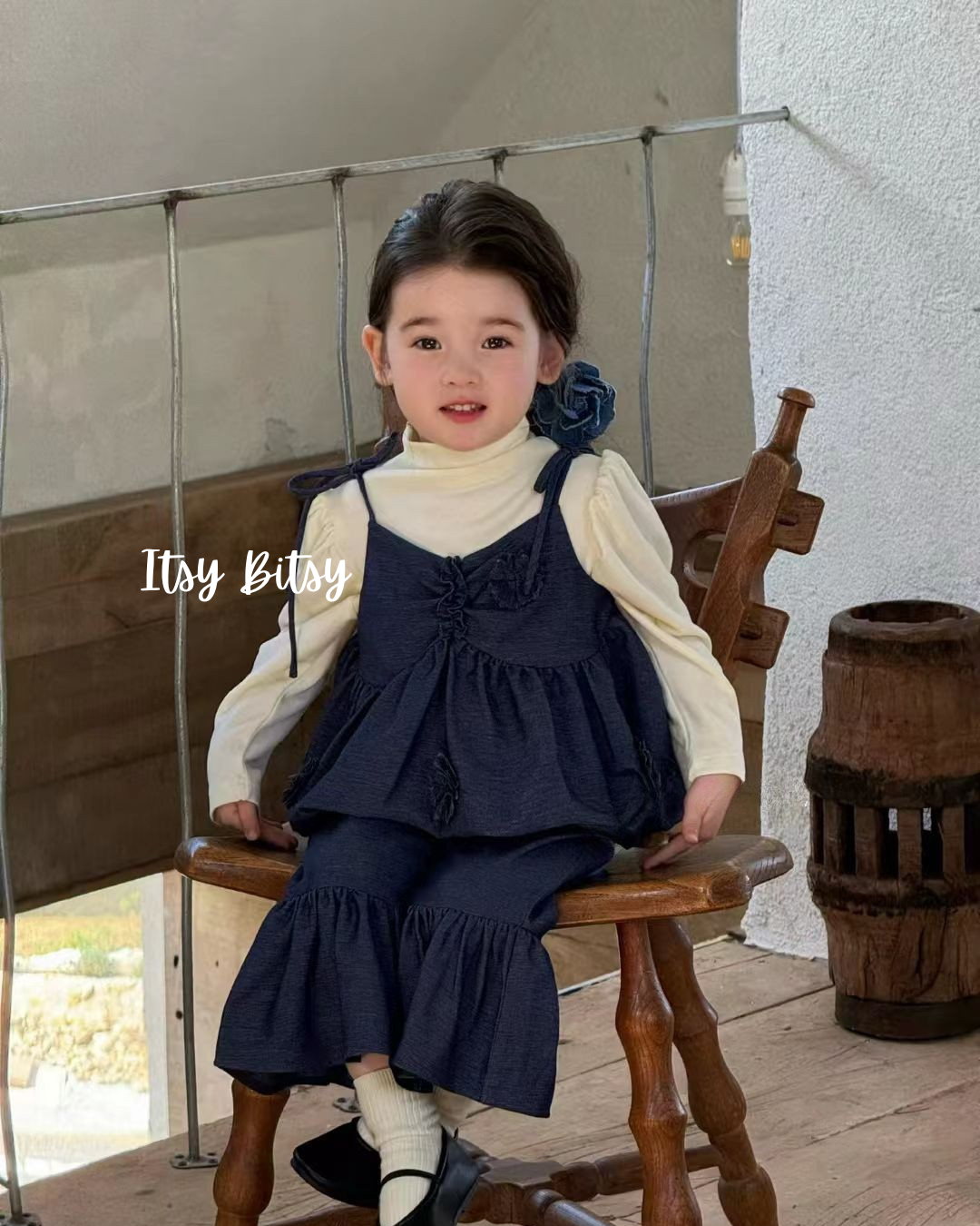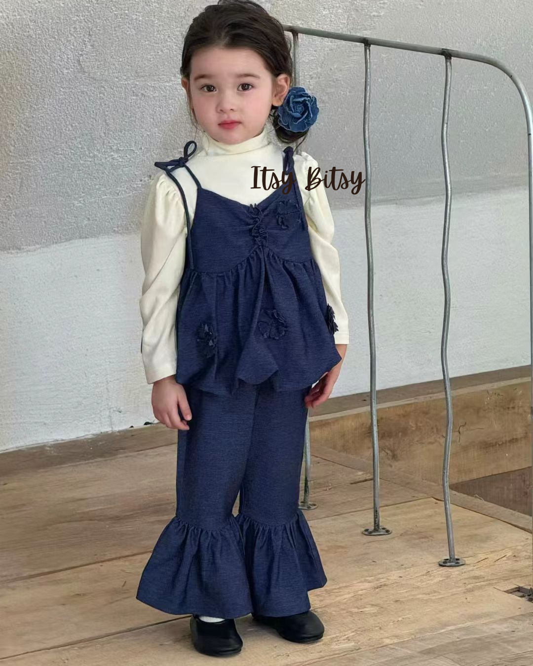Dress your little one in timeless style with this adorable two-piece set featuring a navy blue cami top and matching ruffle-hem pants.