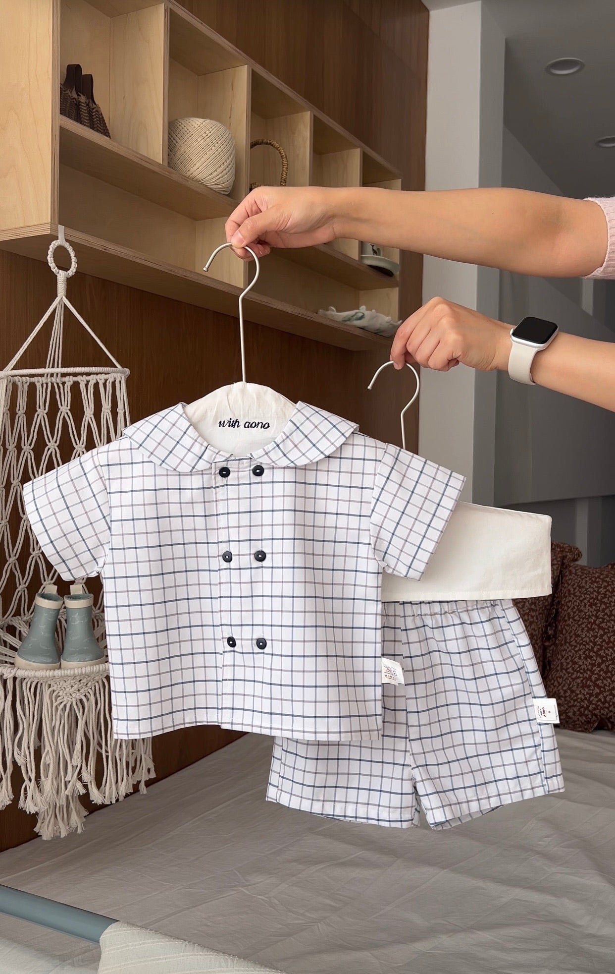 A modern twist on classic charm, the Checkmate Button Set features a crisp grid-patterned shirt with a double-breasted front and matching shorts. Crafted from breathable fabric, this coordinated outfit is both stylish and comfy.