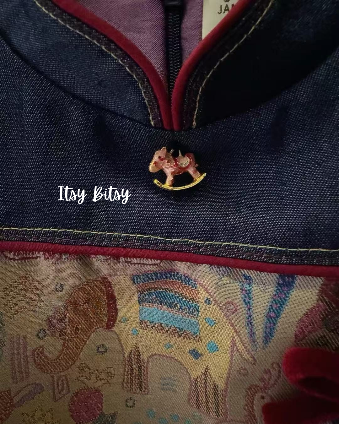 The structured vest features elegant animals patterns, while the layered skirt bursts with red tulle ruffles — evoking fireworks and celebration.