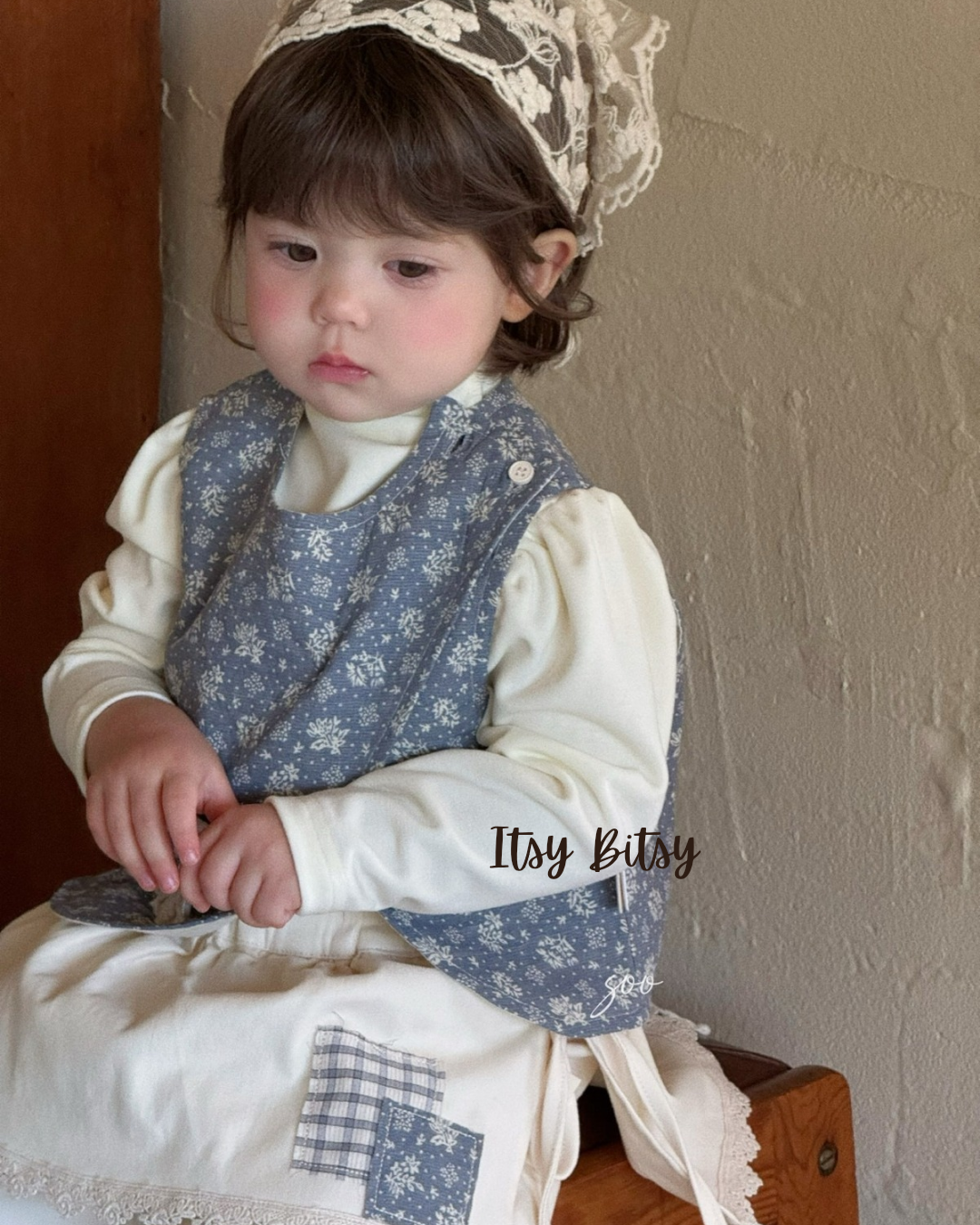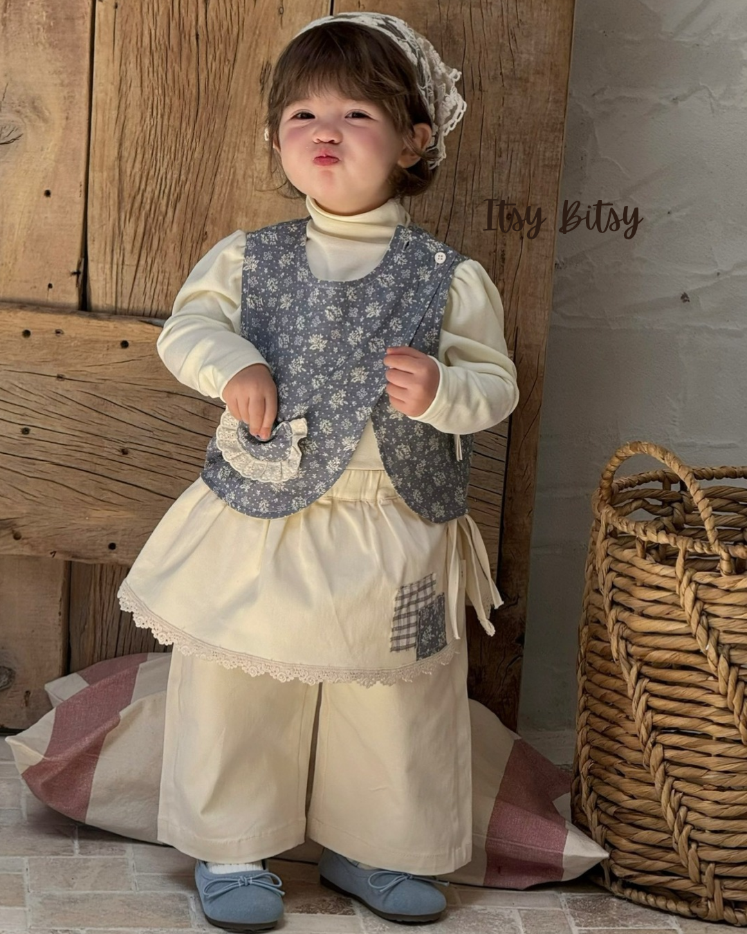 This 2-piece outfit includes a soft cream tunic layered with a delicate lace-trimmed apron, paired with wide-leg trousers for comfort and style. The floral vest adds a sweet vintage touch, featuring tiny blooms and a mini pocket detail for extra whimsy.