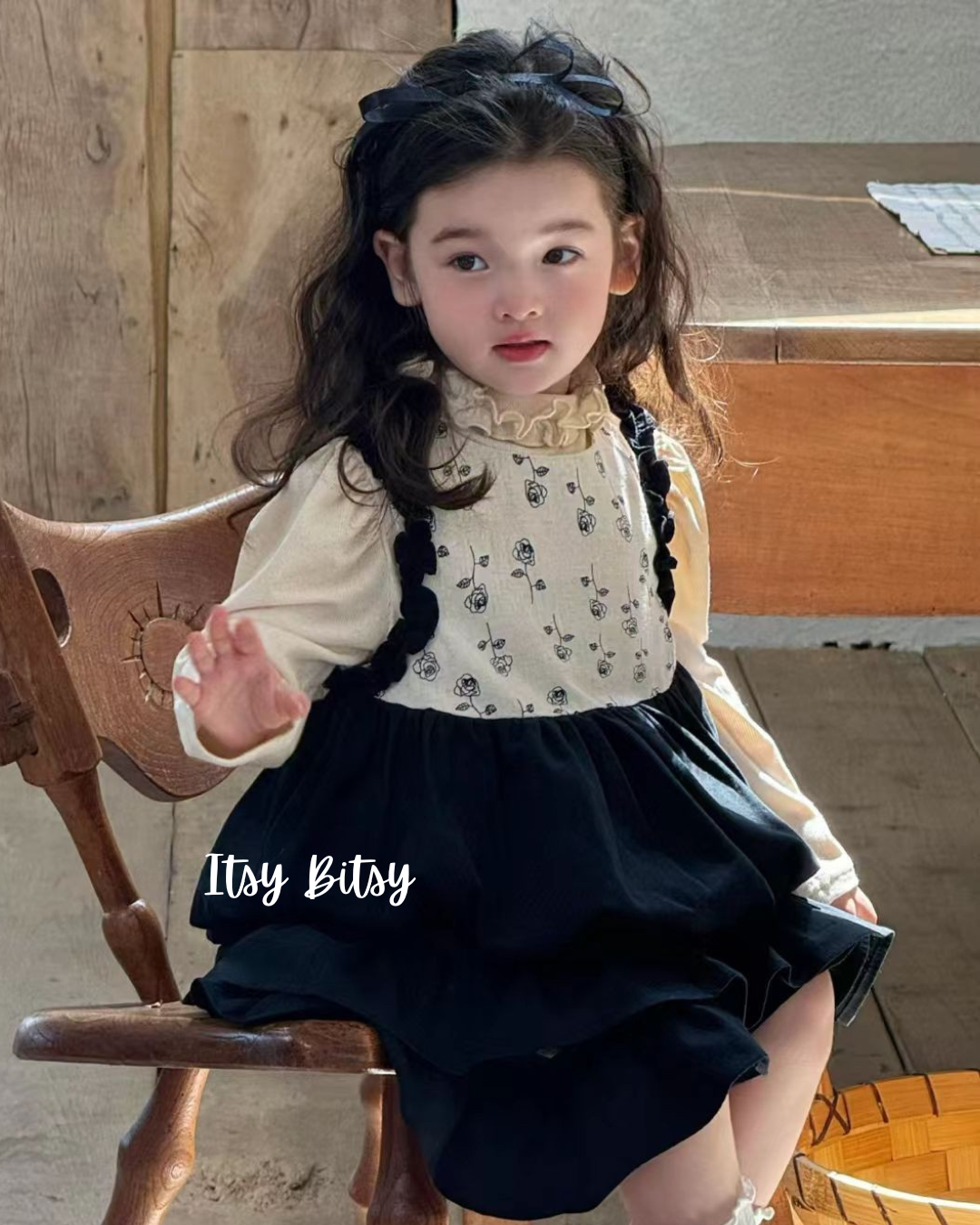 Designed with a sweet floral-embroidered bodice and soft black layered ruffle skirt.
