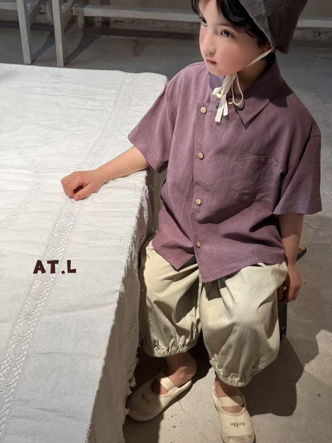 Add a touch of retro charm to your child’s wardrobe with this uniquely styled asymmetric button shirt. Crafted from a breathable cotton-linen blend, this lightweight short-sleeve top features a soft plum-purple hue and a relaxed fit perfect for summer outings or casual layering.
