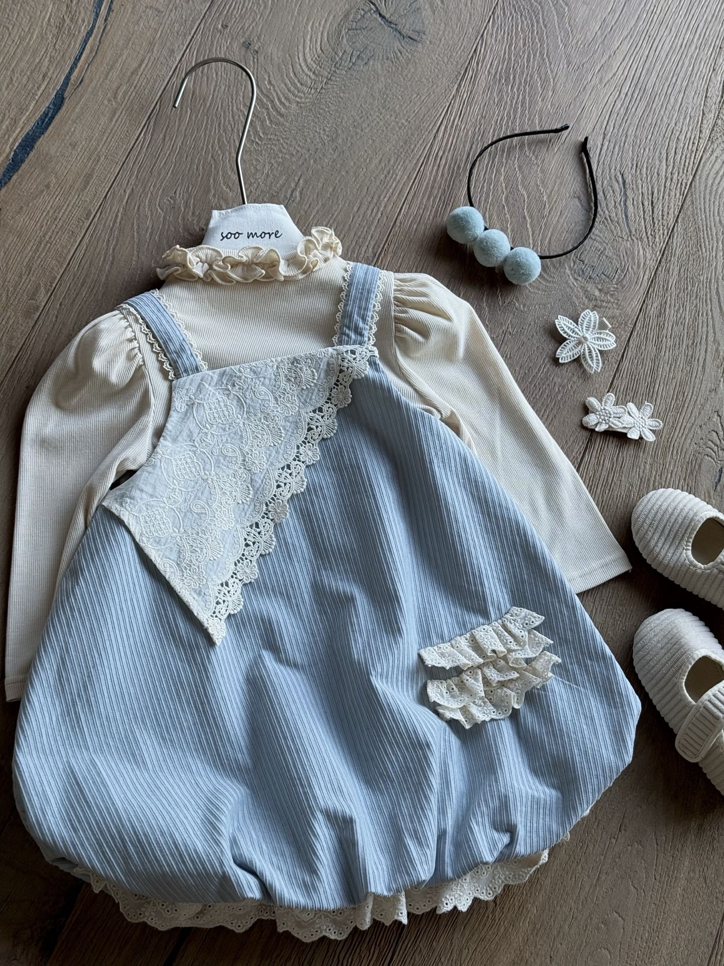Soft blue pinstripes meet delicate lace in this airy,bubble-hem dress.